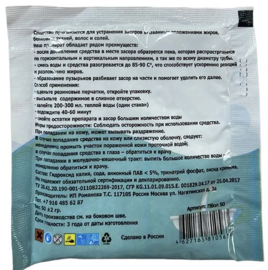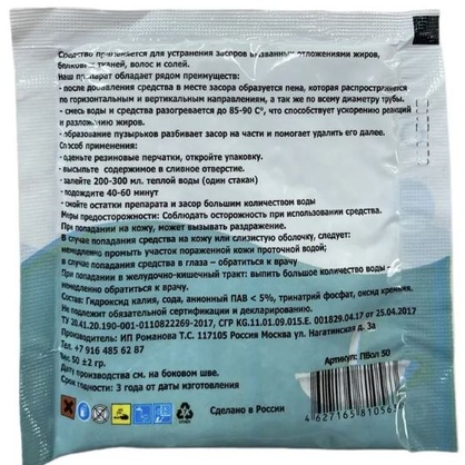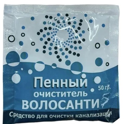 Средство для устранения засоров ПЕННЫЙ ВОЛОСАНТИ 50г. Чистящее средство, содержащее в составе специальные вещества разлагающие кератин волос и биологические ткани, а так же растворяющее обычные бытовые засоры. Применяется в быту для устранения засоров вызванных, накоплением волос, белковых тканей и отложениями жиров. В отличие от простых щелочных средств наш препарат содержит специальные вещества разлагающие кератин волос и биологические ткани.