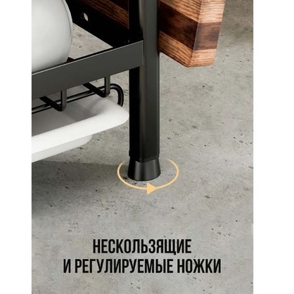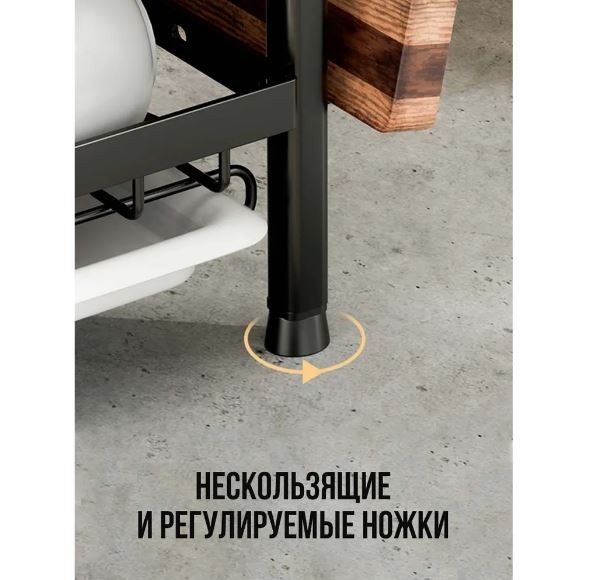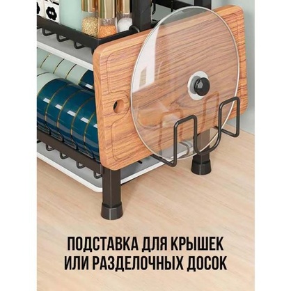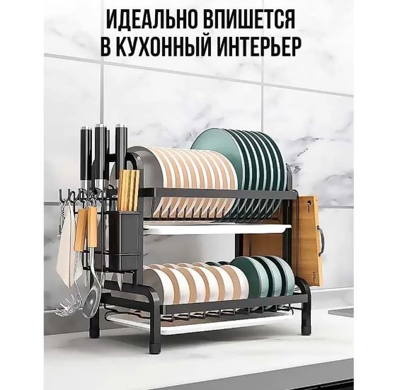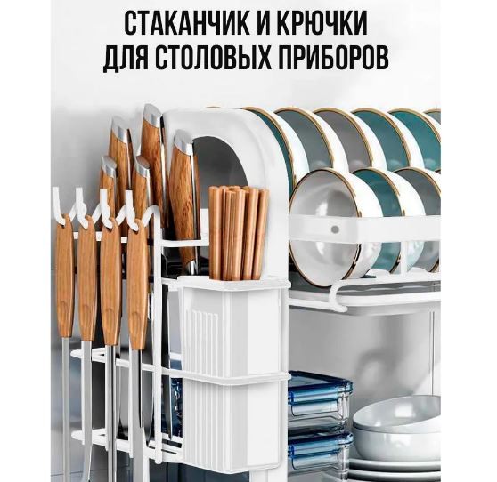 Эргономичная металлическая сушилка для мокрой посуды с отсеками и отделением для столовых приборов имеет два яруса с сеткой. Этажи позволяют разделить посуду для более удобной сушки. Верхняя полка с решеткой предназначена для тарелок и блюдец. Нижняя полочка подходит для набора кружек, чашек, стаканов, бутылочек, банок, стаканчиков, стандартных бокалов, фужеров, маленьких ковшиков и другой посуды. Можно даже разместить внутри моющие средства. Сбоку есть глубокий съемный контейнер на крючках для вертикальной сушки столовых приборов: вилок, ложек, ножей, половников. С другой стороны предусмотрена дополнительная подставка для разделочных досок, подносов или крышек от кастрюль и сковородок. Этажерка - посудосушитель способна выдержать кухонную утварь и другие предметы домашнего обихода общей массой до 30 кг. Снизу у стеллажа есть пластиковый прямоугольный лоток для сбора воды. Он обеспечит чистоту вокруг раковины и позволит посуде быстрее высыхать.