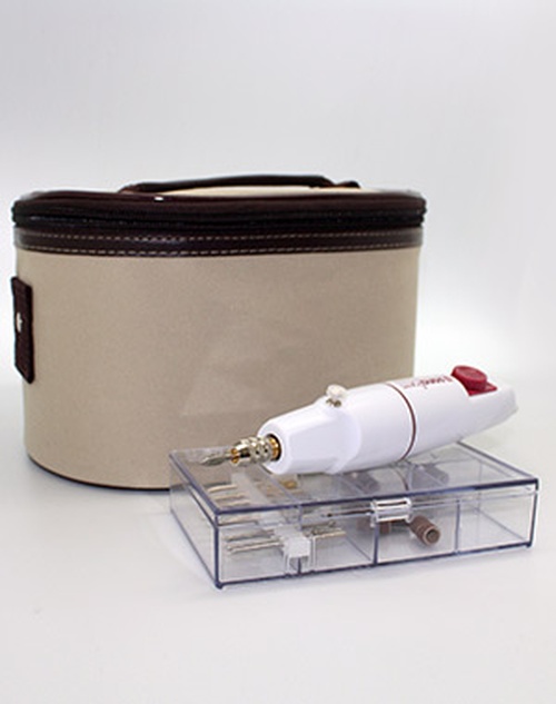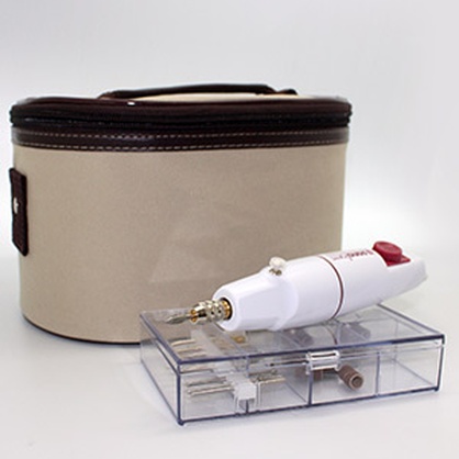 Прибор для высокопрофессиональных процедур маникюра и педикюра в домашних условиях, имеет 11 сменных насадок с абразивным напылением, компактный размер, современный дизайн и сумочку для хранения.