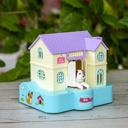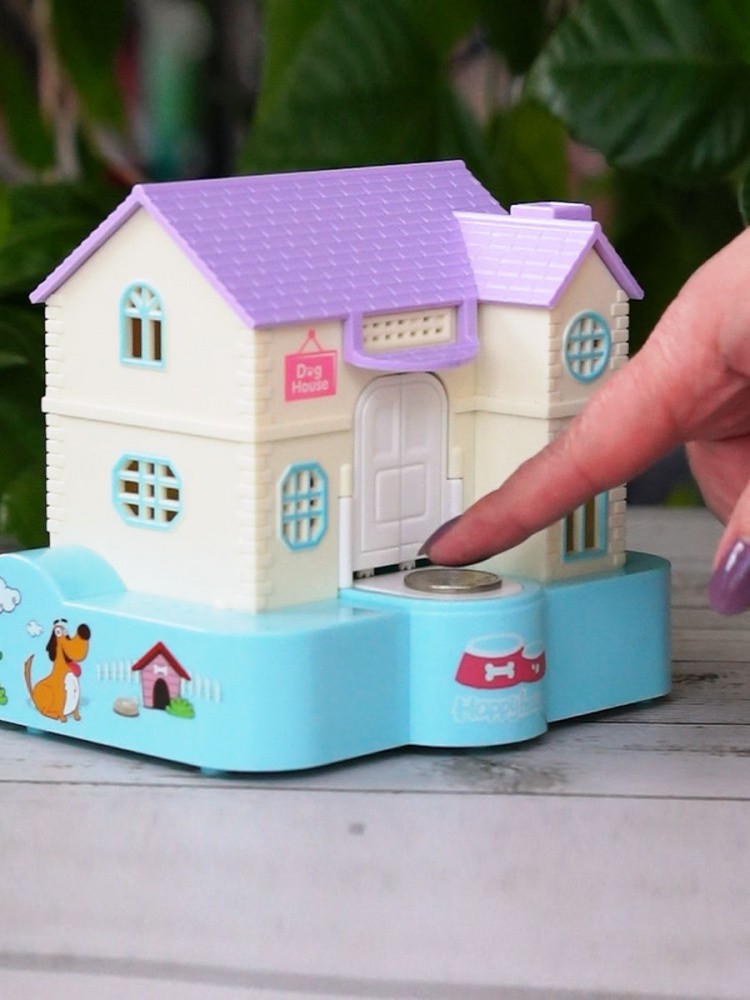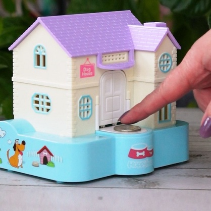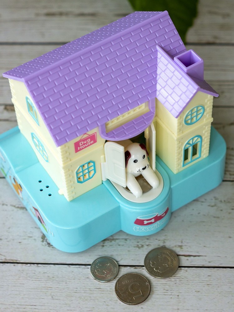 Необычная копилка с выезжающей собачкой Шустриком, быстро утягивающим в домик все монетки, попадающие на крыльцо домика.