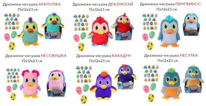 Дразнюки-несушки – это смешные зверушки, при нажатии на пузико которых, они высовывают язык и издают забавный звук. Но эти игрушки ещё и с сюрпризом: нажимая на пузико из несушки выпадают 3 яйца (размер яйца – 6,5 см), в каждом из которых сидит маленький фантастический питомец. С игрушкой можно играть снова и снова. В линейке 6 дразнюк-несушек. На полке игрушка выставлена в красивом индивидуальном дисплей- боксе. Собери их всех!