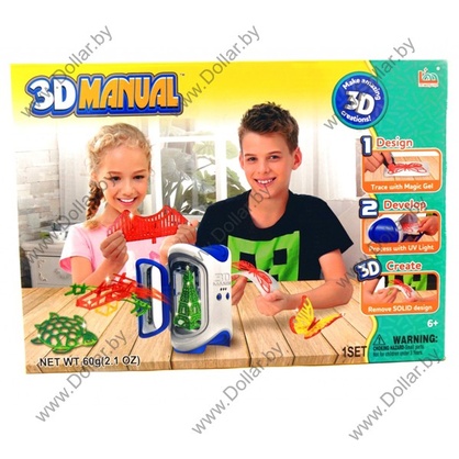 Набор 3D Manual для создания объемных моделей - это новая уникальная разработка, инновационный комплект для творчества, который в работе напоминает современные 3D-принтеры! При помощи ультрафиолетовой лампы и специального геля можно изготавливать объемные красивые поделки. Это могут быть фигурки животных, украшения, модельки транспорта.