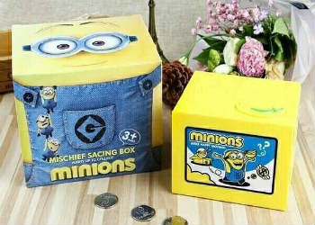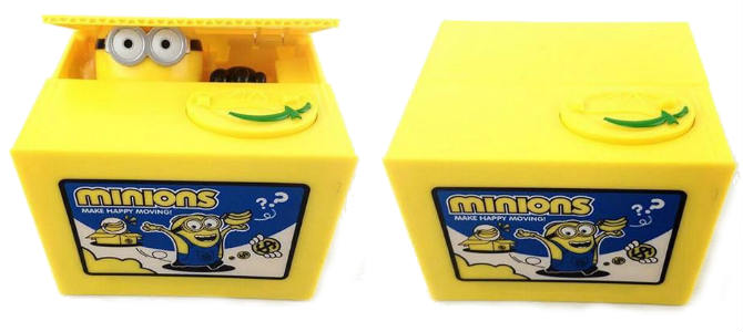 Она изготовлена в виде упаковочной коробочки, в которой и притаился похититель Гадкий Я. Стоит положить монетку на определенную часть копилки, как коробочка приоткрывается, и из нее показывается личико воришки, который высовывает ручку и сгребает копеечку внутрь.