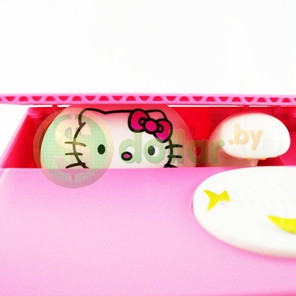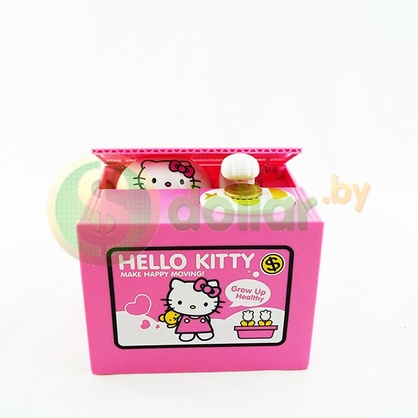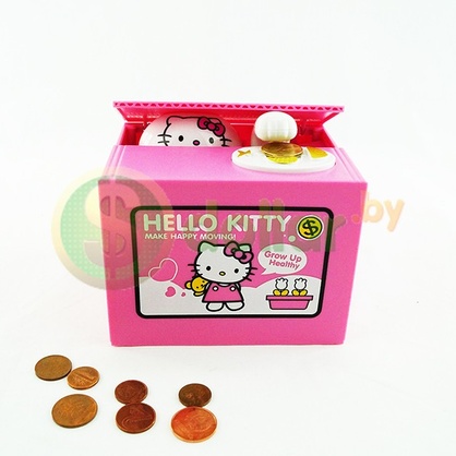 - Крышка коробочки открывается, появляется Hello Kitty, лапкой затягивает монету в коробочку;