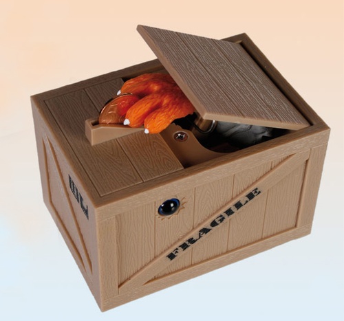 Только представьте: вы кладете монетку в специальный отсек, а копилка начинает издавать непонятные звуки и шевелиться. Затем из нее вылезает когтистая лапа и забирает «подношение». Копилка хватает монетку! Это действительно забавно и интригующе! Именно поэтому столь оригинальное устройство придется по вкусу любому, вне зависимости от возраста.