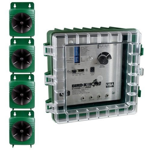 Звуковой и ультразвуковой (2 в 1) отпугиватель птиц "BroadBand PRO" является универсальным устройством, способным излучать как ультразвук, так и биоакустические сигналы (8 тревожных голосов птиц). Воздействие производится черезчетыре выносных громкоговорителя, настройка режимов (периодичность, повторение, громкость, тембр и пр.) производится со встроенного пульта. Корпуса блока управления и динамиков водозащищенные, покрываемая прибором площадь составляет 24000 м2. Питается устройство от сети или внешней батареи 12 В.