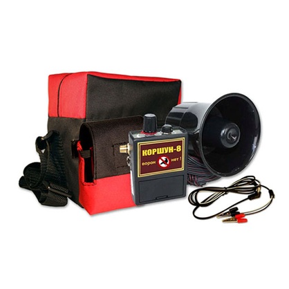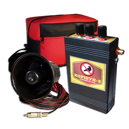 «Коршун-8» - биоакустический отпугиватель птиц, воспроизводящий специальные наборы звуков, которые отпугивают мелких и врановых птиц. Прибор оснащен таймером и сумеречным реле, реагирующим на смену времени суток. Питание может осуществляться от сети 220В или аккумулятора 12В. Отпугиватель способен защитить территорию площадью около 50000 кв.м.