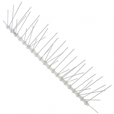 Противоприсадные шипы состоят из отдельных секций. Длина одной секции составляет 50 сантиметров. На каждой секции установлено 50 шипов высотой по 11,5 сантиметра. Шипы расположены в 5 рядов и направлены в стороны под разными углами. К тому же, благодаря гибкости шипов вы можете самостоятельно, без особых усилий зафиксировать их под любым нужным углом. Такая конструкция делает физически невозможной посадку любых крупных и мелких птиц, обитающих в населенных пунктах.