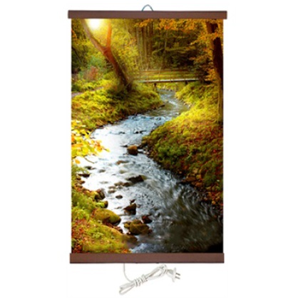Обогреватель представляет собой декоративное панно, изготовленное в виде коврика - картины из полиэфирной лавсановой пленки, внутри которой закреплен современный нагревательный элемент - угольная нить, которая имеет высокую теплопроводность. Все используемое электричество преобразуется в электромагнитные волны инфракрасного диапазона. А его человеческое тело ощущает как комфортное тепло, подобное солнечному свету. Но при этом не сжигается кислород и не сушится кожа. Нанесение реалистичного мотива на внешнее полотно позволяет существенно улучшить его с эстетической точки зрения и превратить в полноценную деталь интерьера. Никто из ваших гостей даже и не догадается, что это обогреватель!