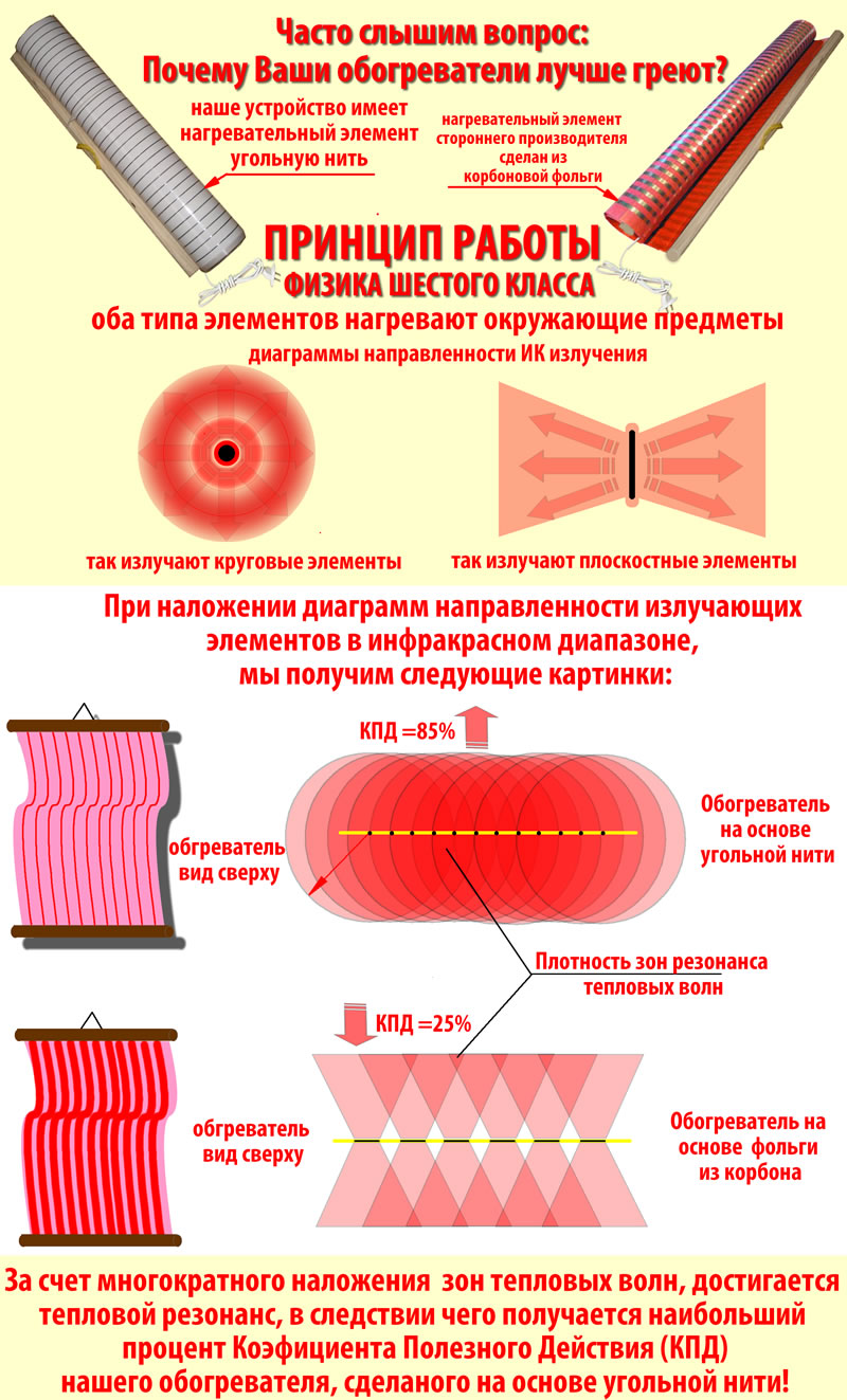 Тепловая энергия, излучаемая настенным обогревателем поглощается окружающими поверхностями, такими как пол, стены, мебель и т.п., нагревая их. В свою очередь они отдают тепло воздуху. Тепловое излучение, аналогично обычному свету, не поглощается воздухом, поэтому вся энергия от прибора без потерь достигает обогреваемых поверхностей и людей в зоне его действия. Это позволяет выровнять температуру воздуха по высоте и снизить среднюю температуру воздуха в помещении, поскольку человек будет ощущать более высокую температуру за счет прямого поглощения энергии от прибора.