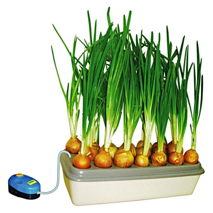 В установке «Луковое счастье» используется Система воздушного питания корней, с помощью которой происходит активное нагнетание мелких пузырей воздуха в воду. При достижении поверхности воды пузыри лопаются, создавая тем самым мелкодисперсионную взвесь воды в воздухе - эффект «водяной бани» между поверхностью воды и донцами луковиц. За счет создания данной воздушно-водной среды корни растений очень быстро достигают воды и быстро увеличиваются в длину.