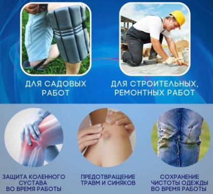 - защитят ваши колени от механических повреждений при выполнении садово-огородных, производственных, и бытовых работ. Придут на помощь садоводам, строителям, туристам, рыбакам;