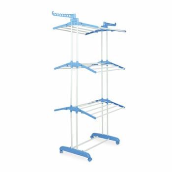 Устройство представляет собой вертикальную складную конструкцию. Очень устойчивая и прочная. Ее удобно хранить, а также легко перемещать, благодаря четырем колесам. Приятная бело-синяя расцветка делает сушилку универсальной для любого интерьера.![]()