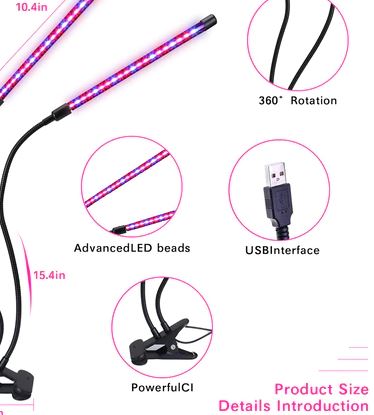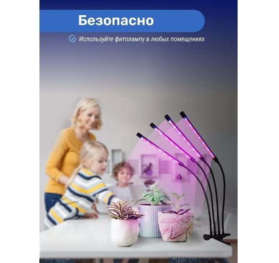 Конструкция данной модели достаточно прочная, имеет четыре гибких прута с светодиодными головками. Благодаря широко открываемой прищепке фитолампа легко крепится к подоконнику, полке, ручке окна и другим предметам. С помощью гибкости каждой отдельной головки, можно подобрать и отрегулировать угол освещения для каждого растения индивидуально. Такая лампа может достигать 360° освещения.