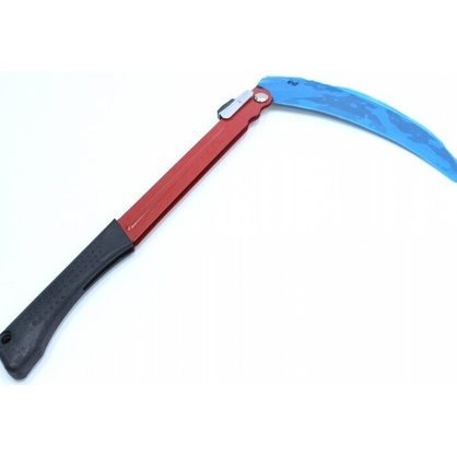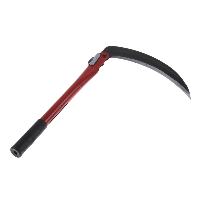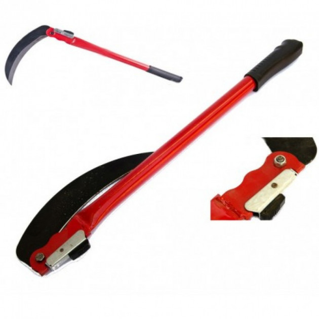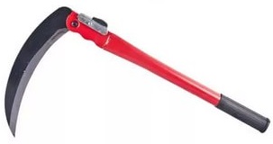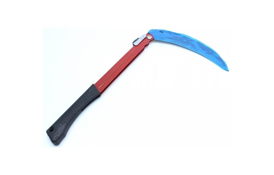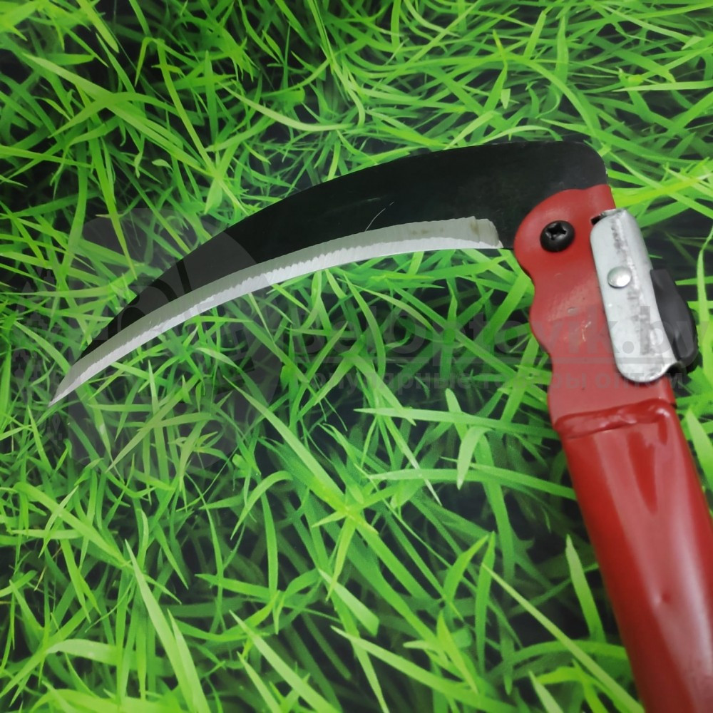 Если вы планируете обработать небольшой участок, то приобрести лучше ручную садовую косу. Серп имеет складную конструкцию, для этого необходимо сдвинуть защелку. Оборудован прорезиненной ручкой.