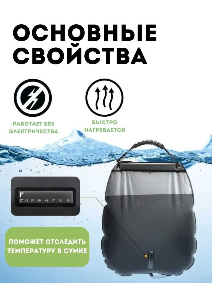 Для использования походного душа необходимо налить в него воду и нагреть на солнце или на плите. Затем, подвесив емкость на дерево или другую подходящую конструкцию, можно начинать принимать душ. Регулируя поток воды с помощью душевой головки, можно настроить комфортную температуру и интенсивность струи. Специальный индикатор температуры воды на сумке поможет вам отслеживать ее.