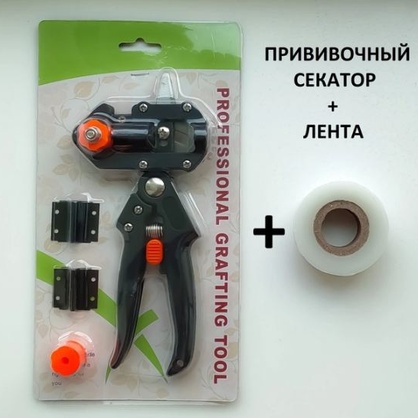 Комплектация: прививочный секатор с тремя ножами (один установлен в прививочный секатор и два отдельно) и запасным упорным барабаном + прививочная лента (прозрачная, ширина 3 см, длина 100 м, хорошо тянется, удобная в применении).