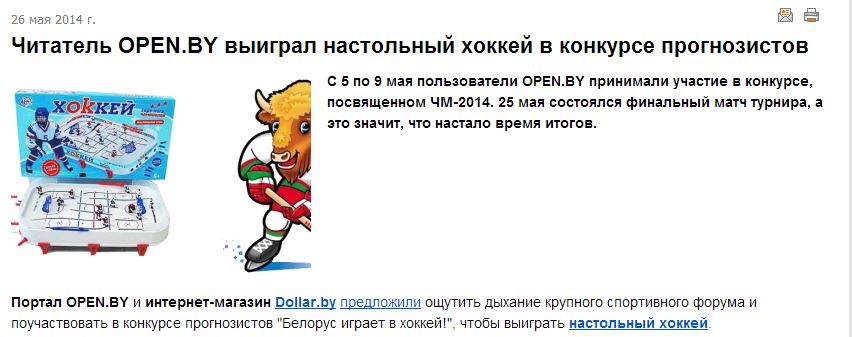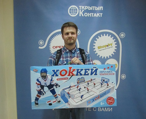Сегодня, 30 мая, победитель забрал в офисе Open.by свой заслуженный приз – настольный хоккей. Интернет-магазин Dollar.by благодарит портал OPEN.by за организацию достойного конкурса, а пользователей портала – за активное участие в нем.